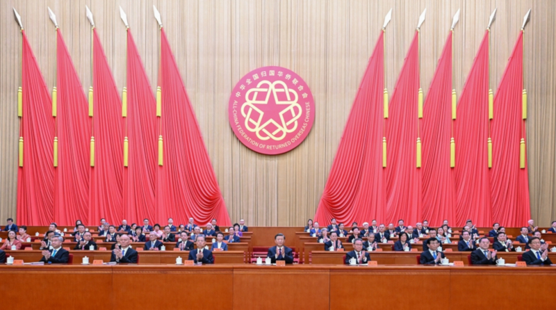 人民大会堂大礼堂气氛庄重而热烈。主席台上方悬挂着“第十一次全国归侨侨眷代表大会”的会标,后幕正中是象征着五大洲侨胞心向祖国的中国侨联会徽,10面红旗分列两侧。二楼眺台悬挂着“以习近平新时代中国特色社会主义思想为指导,全面贯彻党的二十大精神,团结凝聚广大归侨侨眷和海外侨胞为全面建设社会主义现代化国家、全面推进中华民族伟大复兴而奋斗!”巨型横幅。来自全国各地的近1200名归侨侨眷代表和来自100多个国家的近600名海外侨胞特邀嘉宾欢聚一堂。