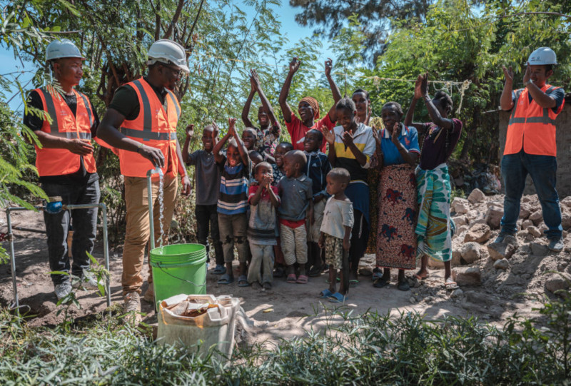6月13日,在坦桑尼亚姆万扎省米松圭,凯尔文(左二)与同事接通水管后赢得当地居民鼓掌欢呼。新华社记者 王冠森 摄