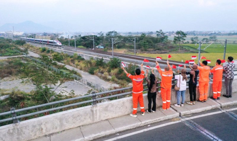 10月17日,在印度尼西亚万隆一座天桥上,雅万高铁建设单位之一中铁电气化局的中国和印尼籍员工挥舞着中国和印尼两国国旗,向远处驶来的一列雅万高铁高速动车组列车欢呼(无人机照片)。新华社记者 徐钦 摄