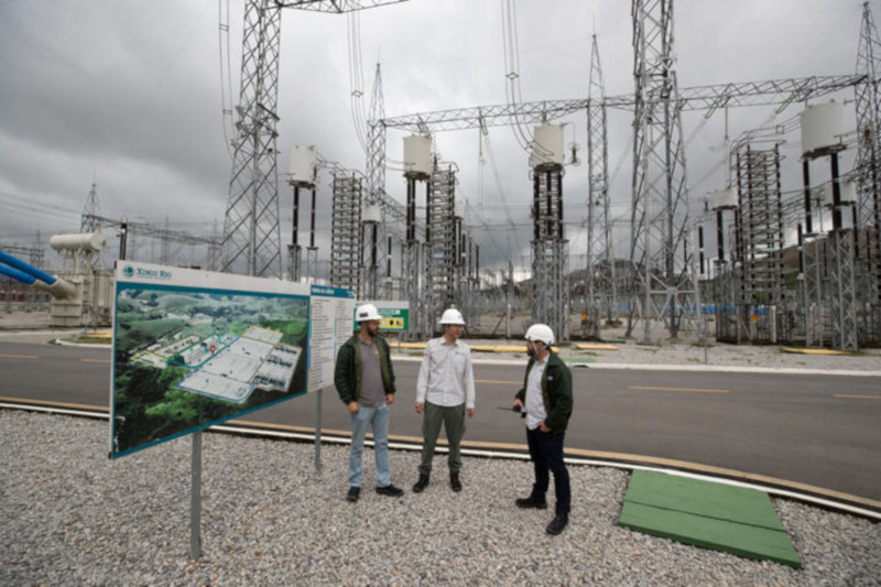 2022年9月30日,在巴西里约热内卢美丽山特高压输电二期项目里约换流站,国网巴控公司换流站运维主管(中)和巴方人员交谈。新华社记者 王天聪 摄
