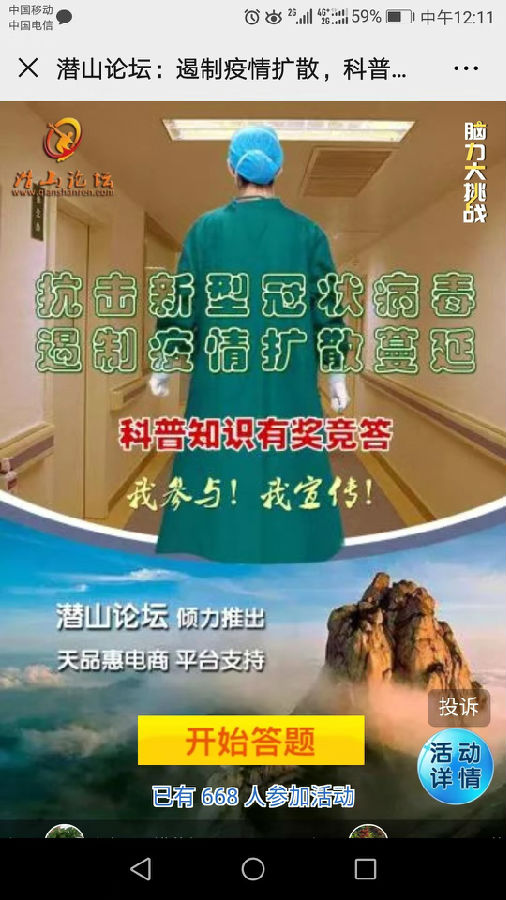 近日,潜山论坛开设《遏制疫情扩散,科普知识竞答》,引导市民了解防疫知识,并赠送口罩。(党外知识分子工作科)