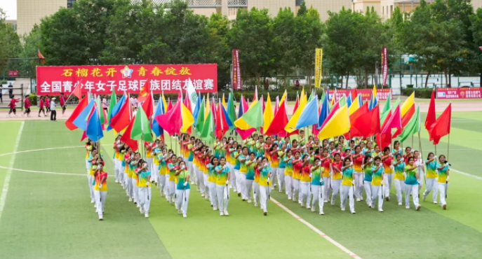 ▲2025年8月5日上午,由全国妇联、国家民委、国家体育总局联合举办的“石榴花开 青春绽放”全国青少年女子足球民族团结友谊赛,在新疆喀什大学新泉校区体育场开幕。