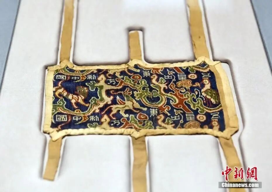 新疆和田地区出土的一件汉代织锦护臂,上面织有“五星出东方利中国”八个篆体汉字。中新社记者 刘新 摄